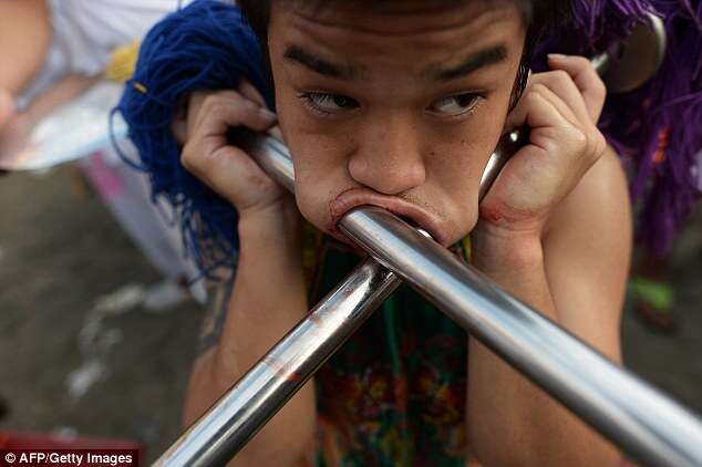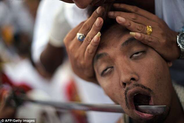 Fotos do Ritual tailandês faz com que fiéis furem suas bochechas com espadas em busca da paz de espírito