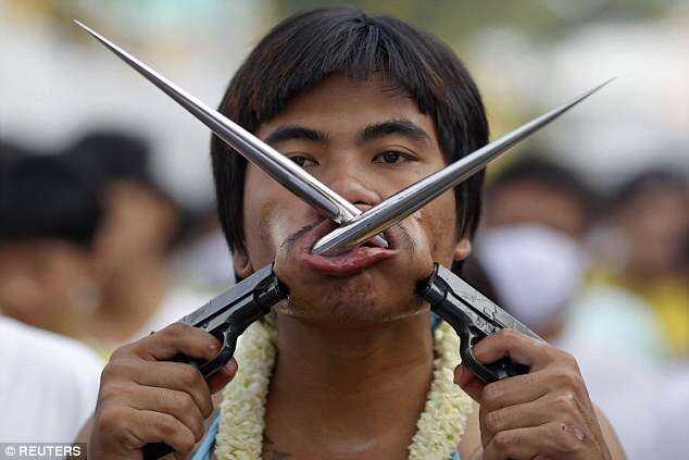 Um ritual não muito comum para a maioria das pessoas chama a atenção na Tailândia. Espiritualistas furam suas próprias bochechas usando espadas e outros itens em busca da paz de espírito.Centenas de vegetarianos no sul do país acreditam que a perfuração em seus rostos usando objetos incomuns aliada ao abster-se de carne irão baní-los do mal. Todos os anos, milhares de pessoas viajam para o Santuário Neow, em Phuket, para assistir ao festival inusitado.